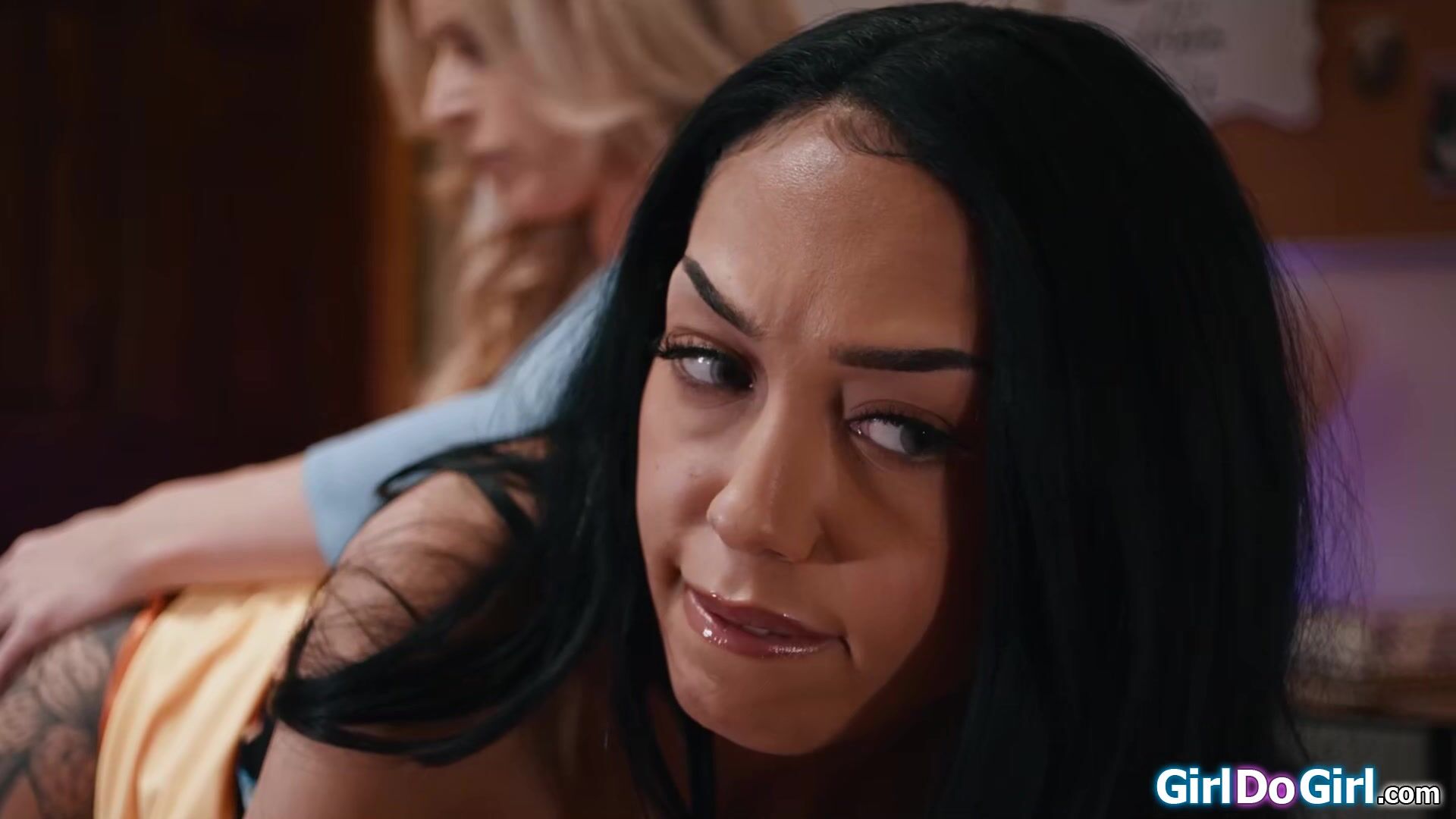 Busty stepmom Danielle Renae catches her stepdaughter Bianca Bangs sneaking out again and decides to spank her.The small tits teen enjoys it a bit to much and the milf goes even further by licking her.The cougar makes her suck tits and rim her