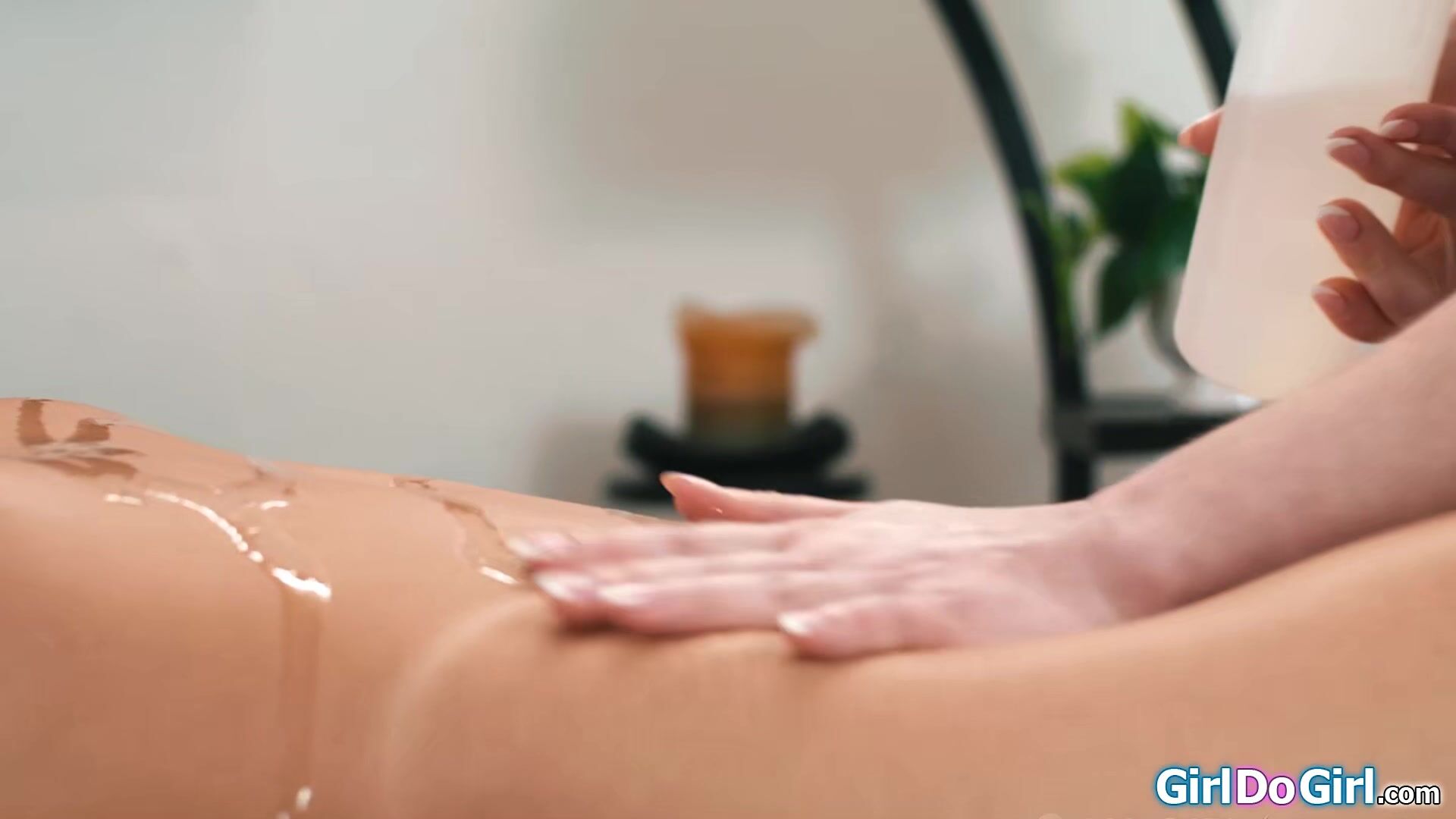 Aria Sloane walks in on her masseuse colleague Maddie Wren while she massage busty Ivy Ireland.They chat while she licks her clients hairy pussy.All oiled up the babes scissorfuck and the big tits brunette fucks the small boobs masseuse her toe