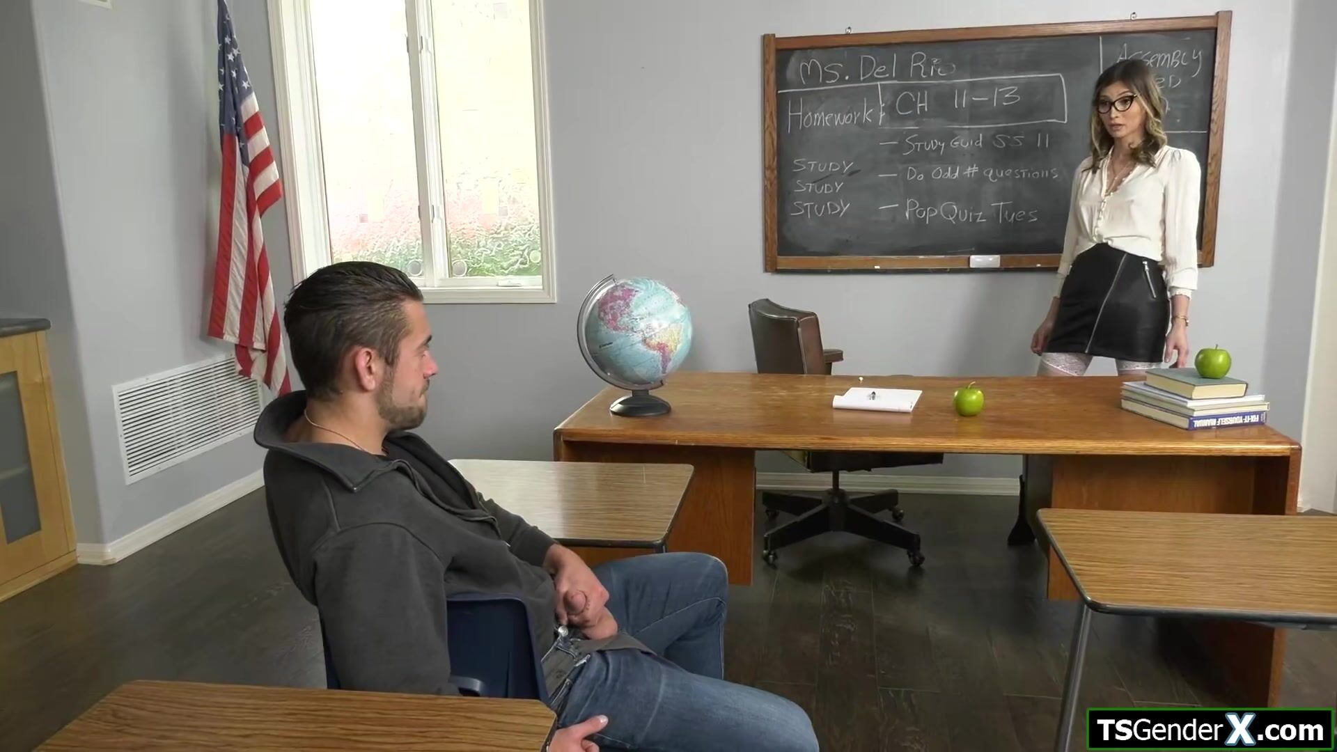 Dante Colle is jerking off on his super hot shemale teacher Korra Del Rio.The busty tgirl is mesmerized by his cock and takes out her own trans dick for him to deepthroat.The big tits tranny sucks him off and is masturbated while shes anal barebacked