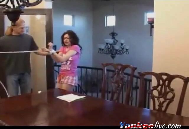 Dumb skank gets all tied up, tape gagged and fucked on a table