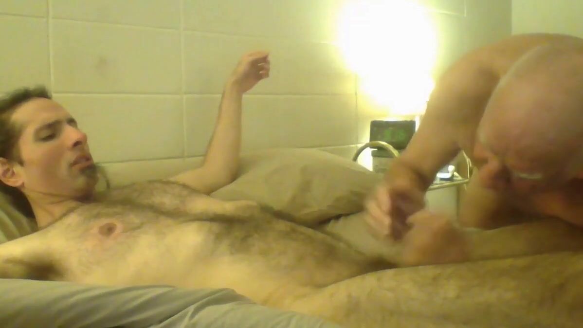 An elderly man squeezes, sucks and kisses a young mans nipples and sucks his cock.