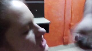 White hooker sucks small pencil dick and gets cum on her face.