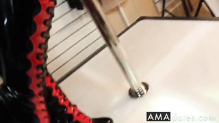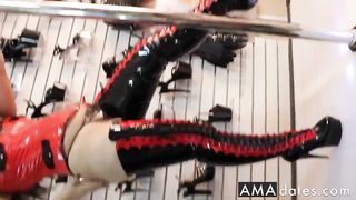 Very Sexy Dirty Girl In A Shiny Squeaky Creaking PVC Outfit PVC Thong Panties PVC Thigh High Platform Boots Love Her Ass.