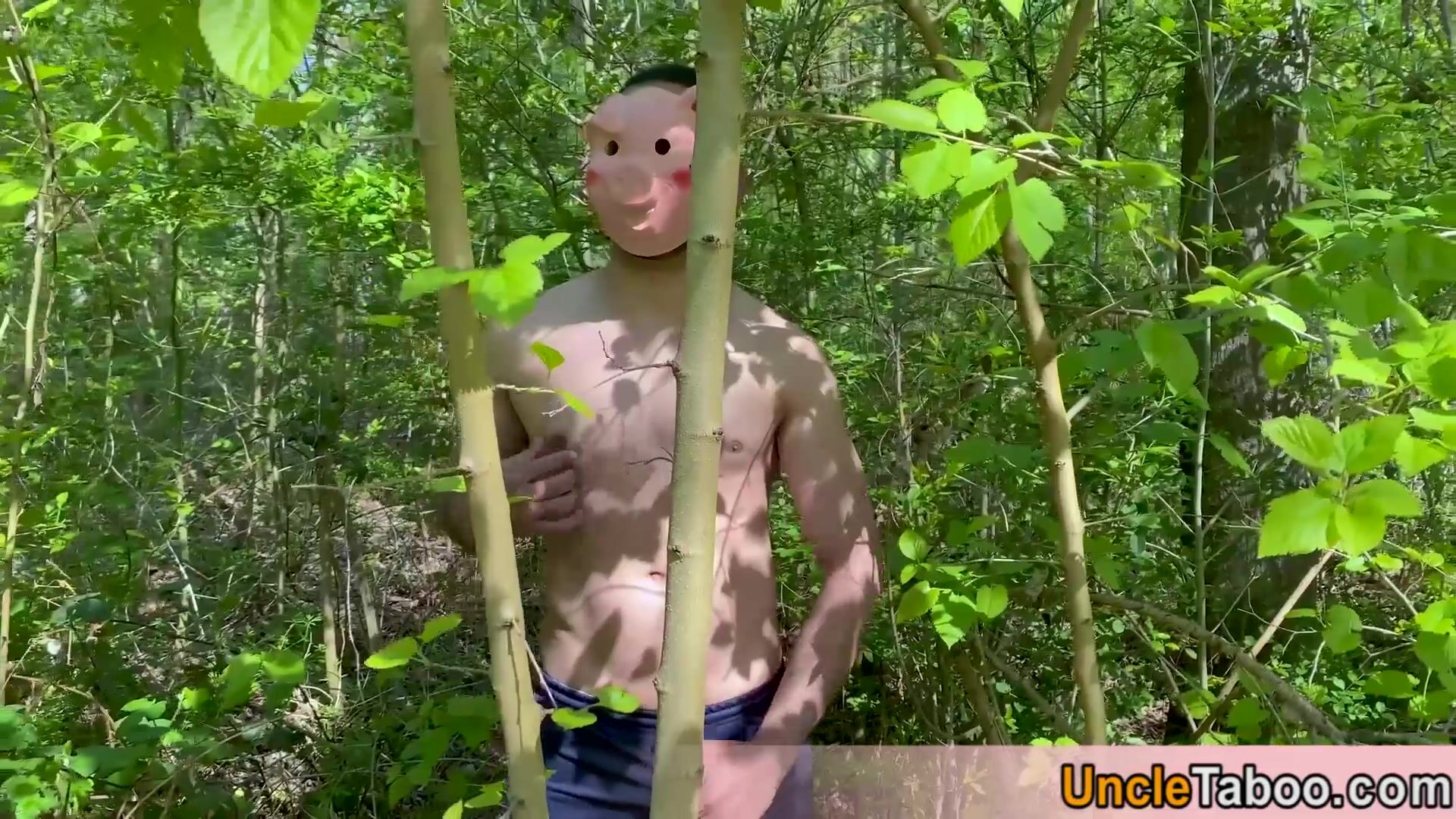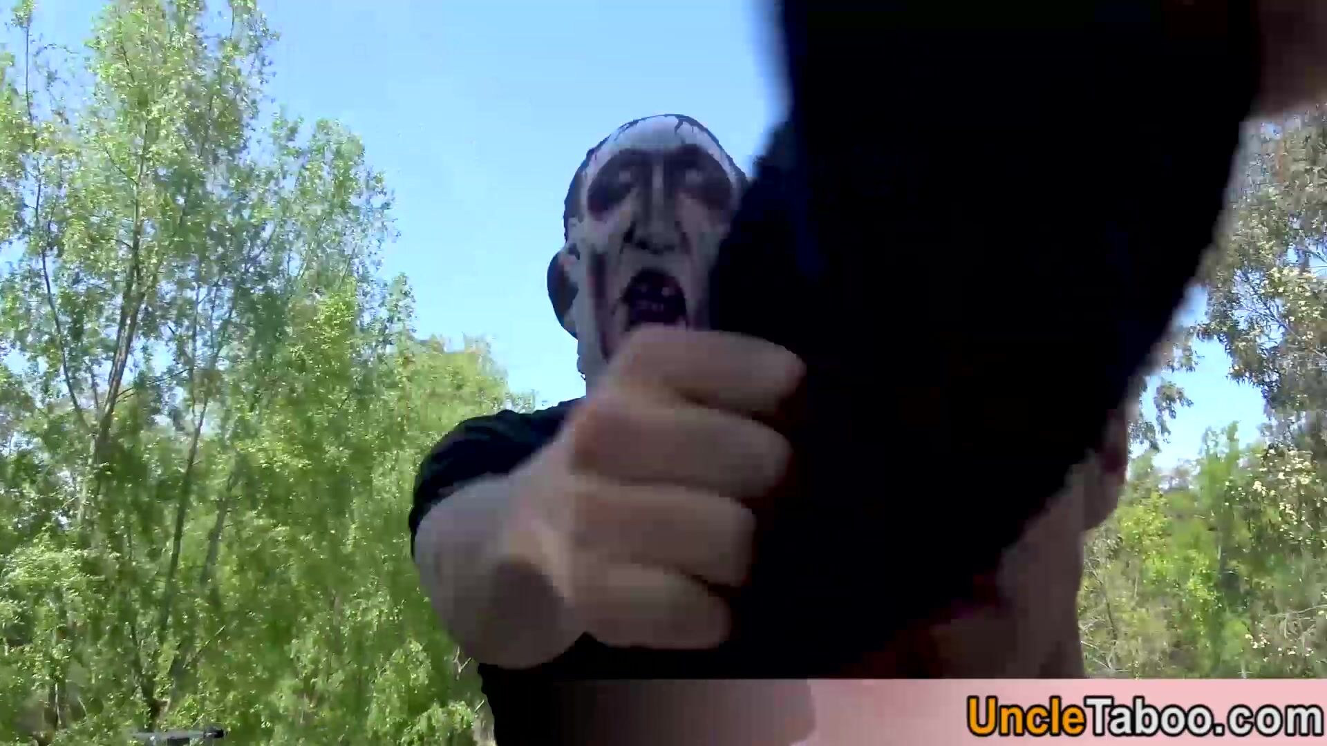 Five masked strangers carch a scared stud to fulfil their darkest fantasies they order him to suck their big cocks then they anal fucking him bareback on by one in the forest outdoor
