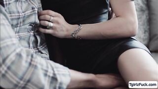Brunette TS starlet Ariel Demure spreads her legs and shows off her stiff shecock in sexy panties. Muscle stud feeds her his throbbing cock, and she gives him a worshipful blowjob before a boucny anal ride.