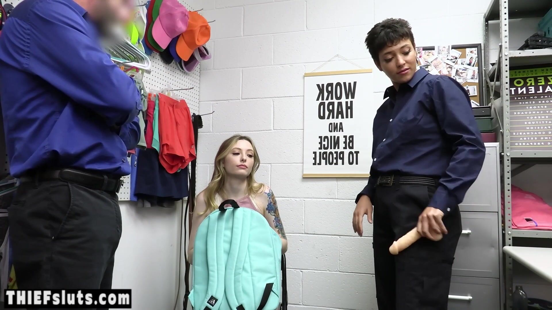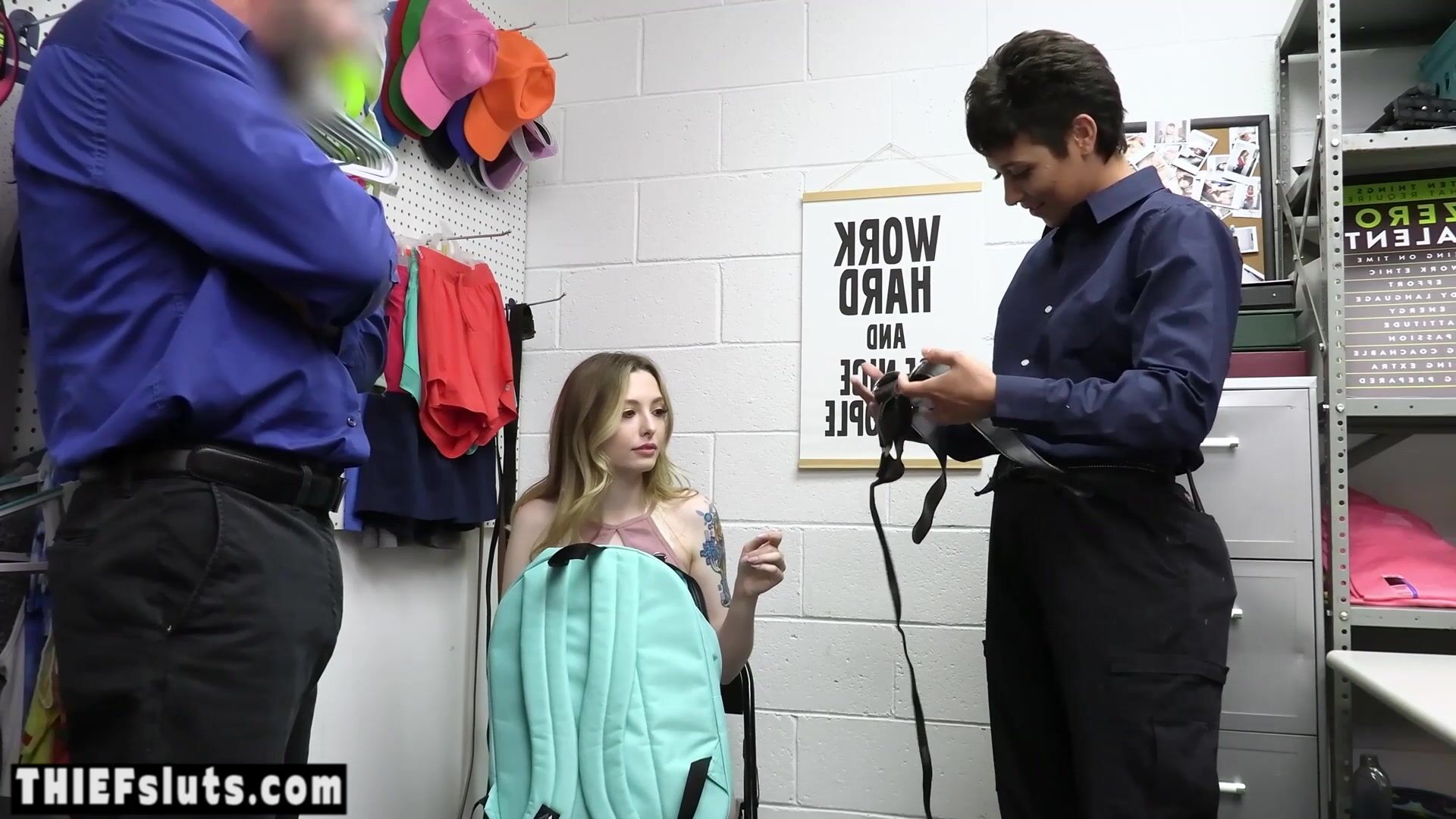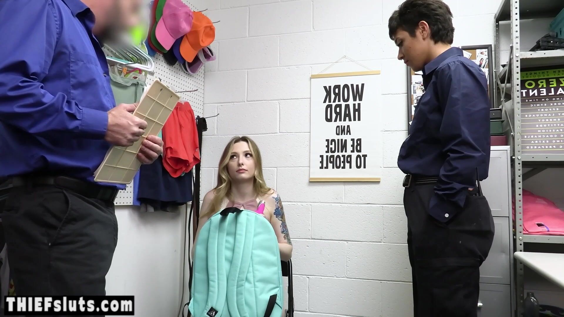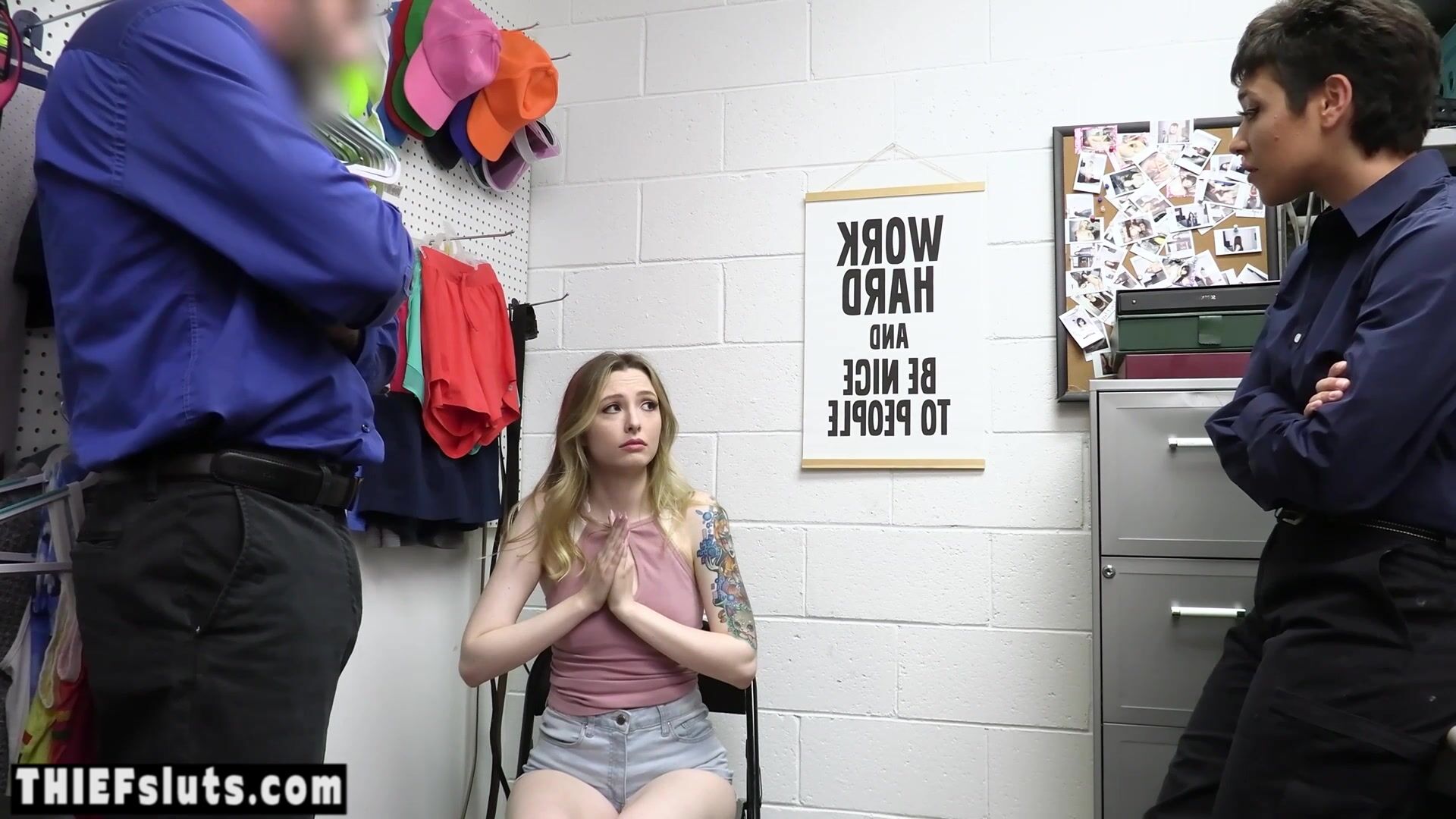 Busty inked blonde teen shoplifter Ailee Anne tried to steal dildos but she got caught by lesbian latina MILF LP officer Brooklyn Gray with big boobs who strapon fucked her then her partner comes and banged bot of them during they licked each other