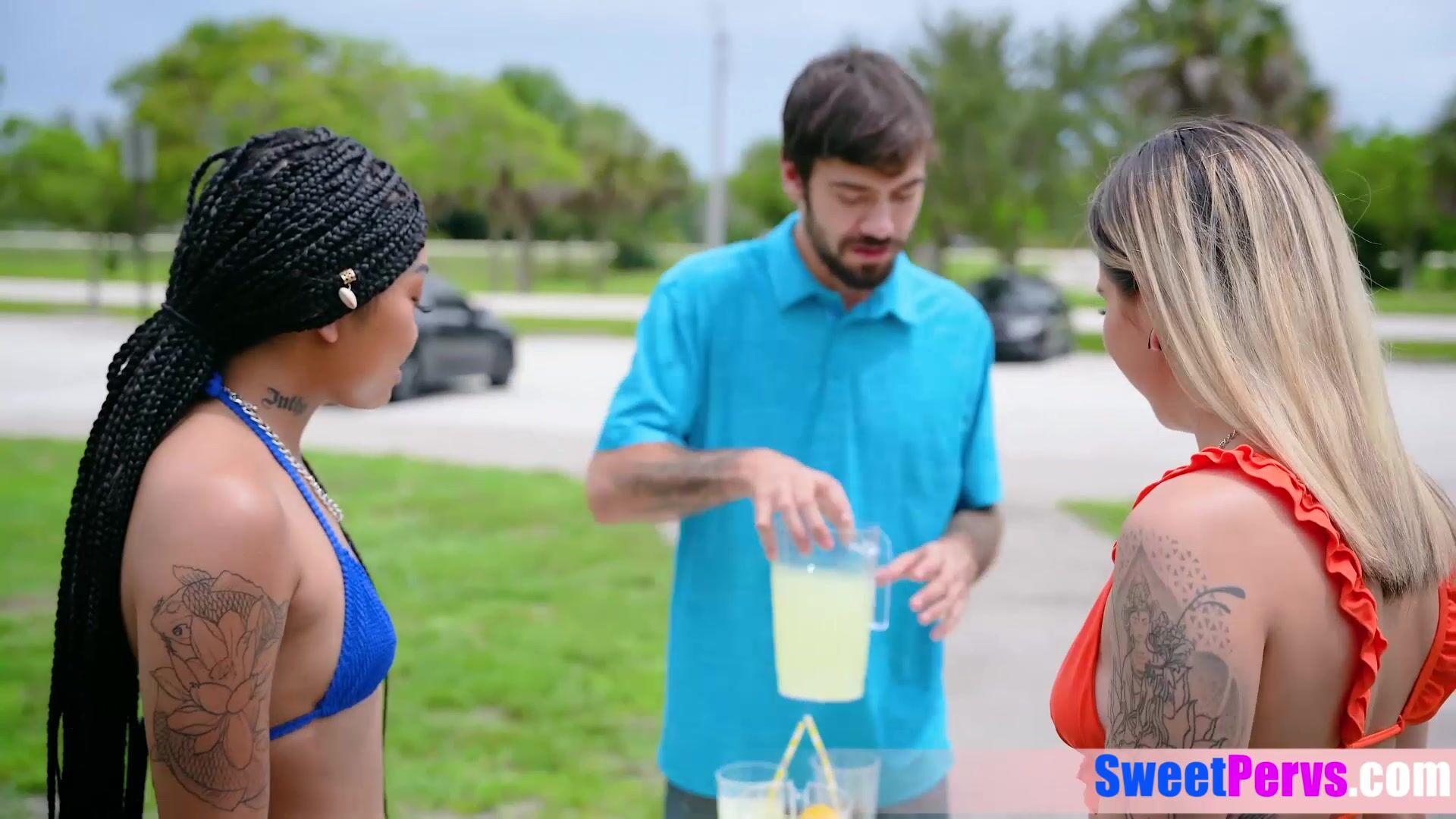 Petite ebony and asian teens with small tits have to make some money so they decide to sell lemonade at the park but they using their pussies too to get more money They sharing a strangers big dick and fucking it during licking each other