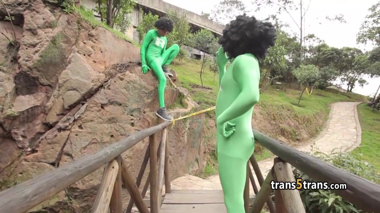 Two lucky guys in costumes got themselves small tits latina shemale with big booty She sucked their big shafts and enjoyed fucking her tranny hole