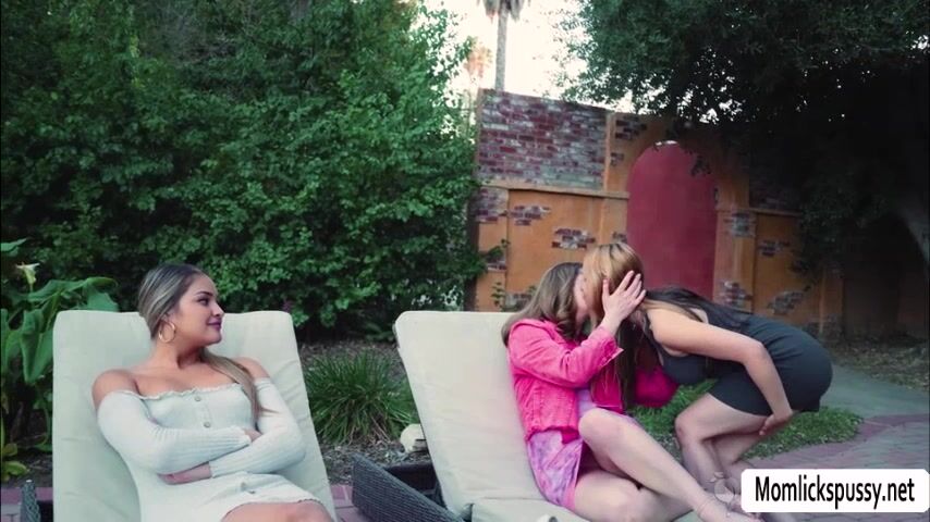 Busty teen is talking on the new girlfriend of her stepmom.After that,they get horny and go inside the house and start kissing each other passionately.Next is,she goes down and licks the pussy of stepmoms new girlfriend.