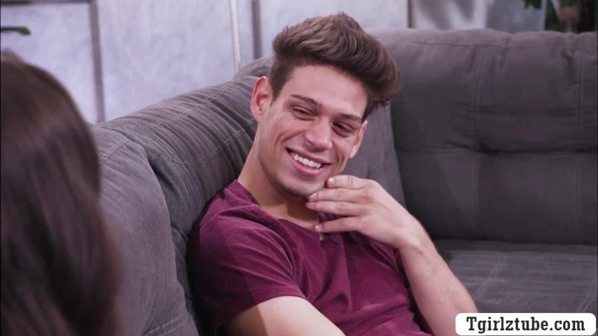 Busty babe and her boyfriend are on the couch talking about his shemale mistress.After that,instead of getting mad,they decide to do threesome sex.They start kissing each other and they suck each others cock.Next is,he fucks the ass of his mistress.