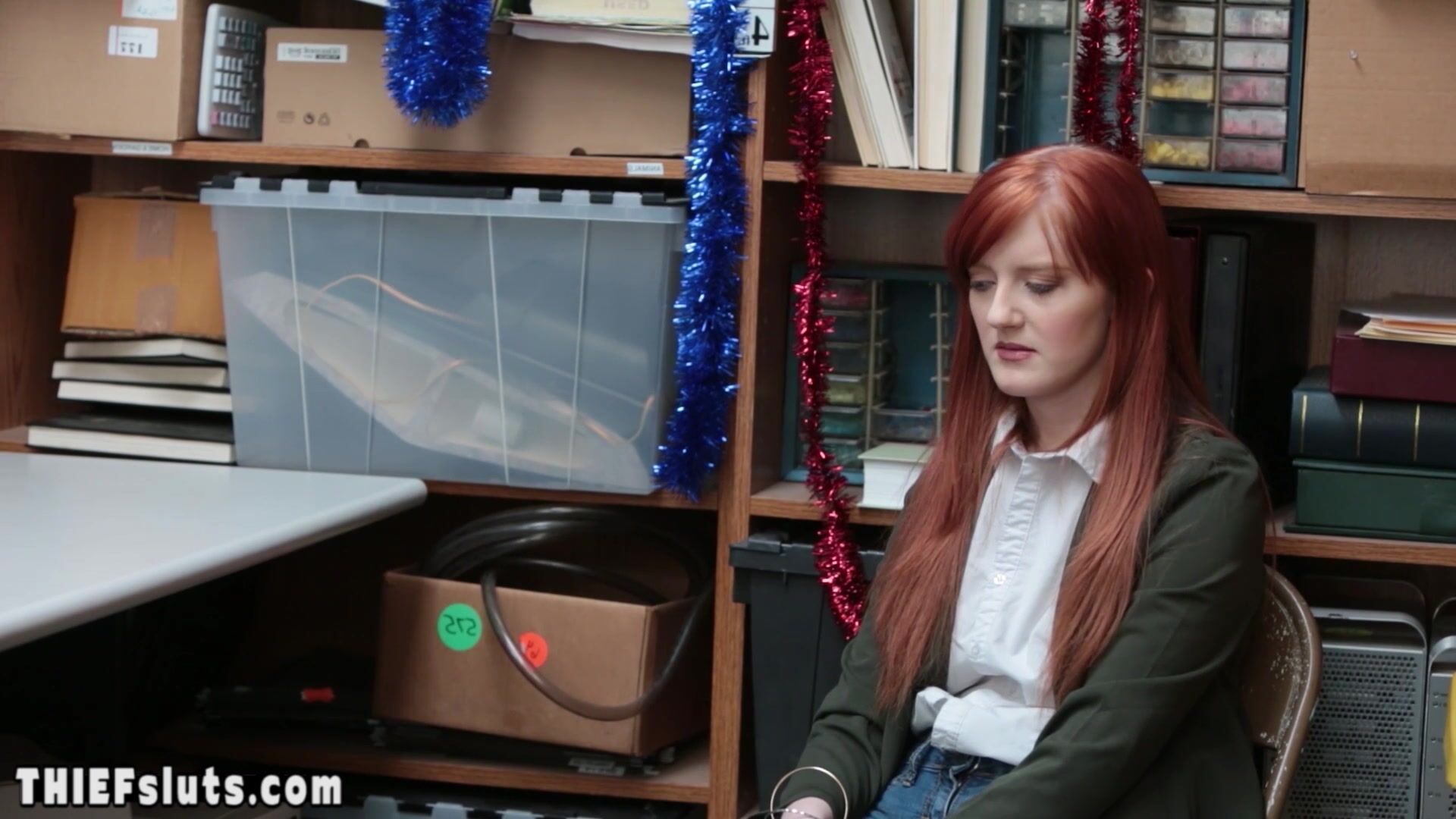 Pale skinned redhead teen shoplifter Krystal Orchid with natural perky tits strip searched in a backroom by a perf security guard who is teaching the rules to her She has to suck his big cock then he is banging her shaved pussy hard