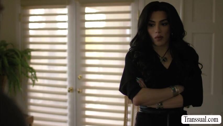Brunette shemale goes to the house of her ex boyfriend and talk about the sex video he send to her.Instead of getting mad,they start kissing each other and she then throats his big cock passionately.Next is,she lets her ex boyfriend fuck her ass.