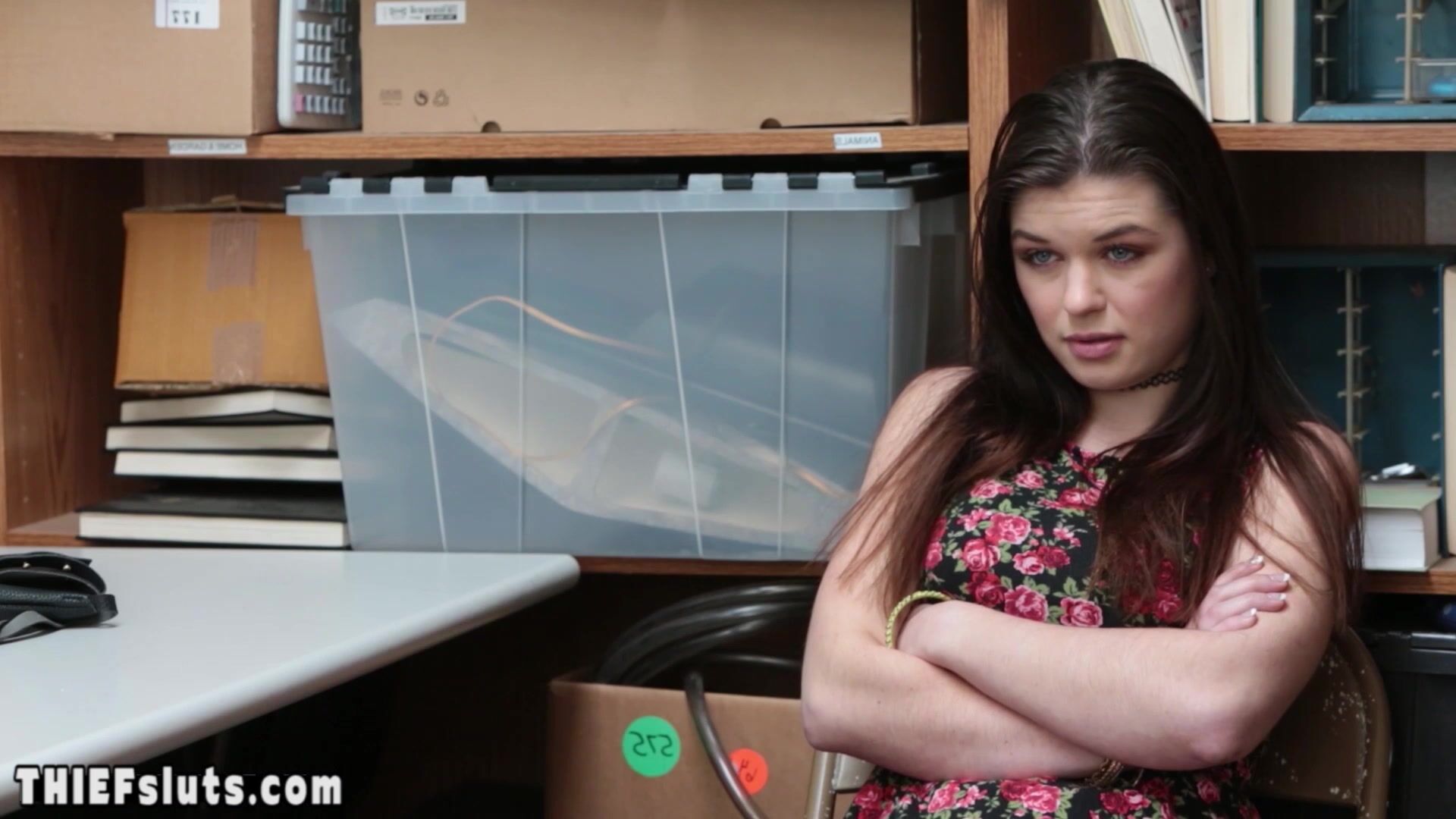 Pale skinned brunette teen shoplifter Anastasia Rose with big tits has to satisfy a LP officers dirty wishes to avoid jail She is giving deepthroat blowjob then the big cocked dude fucking her hard on CCTV