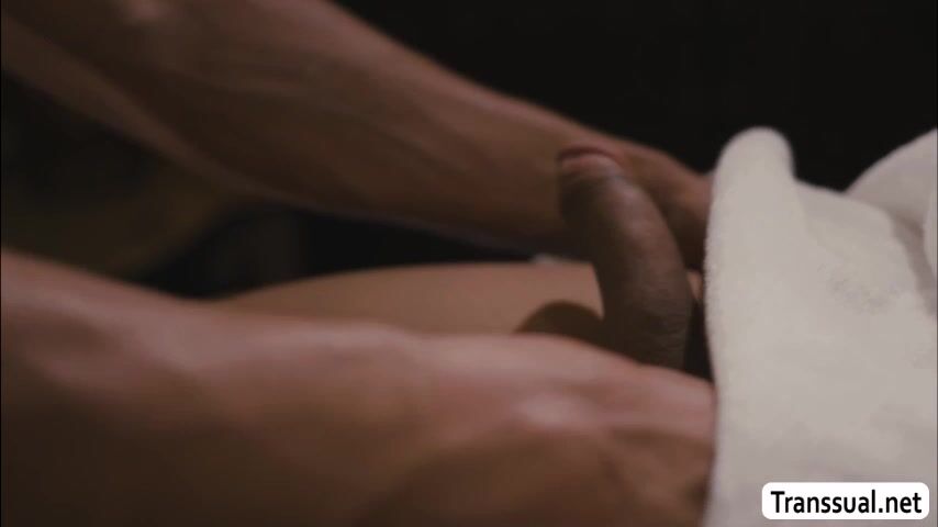Black masseur lets his TS customer get naked so he can start massaging her body.After that,he starts oiling her body and massage it passionately.Next is,he get horny and start sucking the tits of his customer.In return,she suck her cock and rides it.