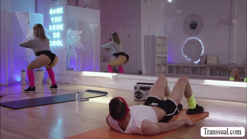 Curvy TS Emma Rose is working out with her partner.After that,they get horny and they start kissing each other.Next is,she throats his big cock first passionately and she then fucks his tight wet ass so deep and hard.