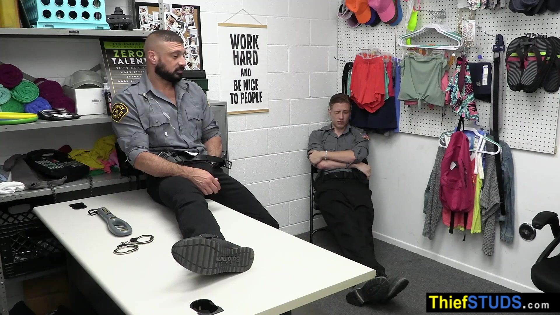 LP officers Cole Church and Marco Napoli are trying to get through their shift but there hasnt been any perps to catch so the muscle gay gets on his knees and sucking his partnes big dick then the twink cop fucking him bareback in doggystyle