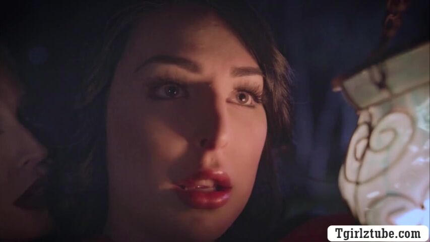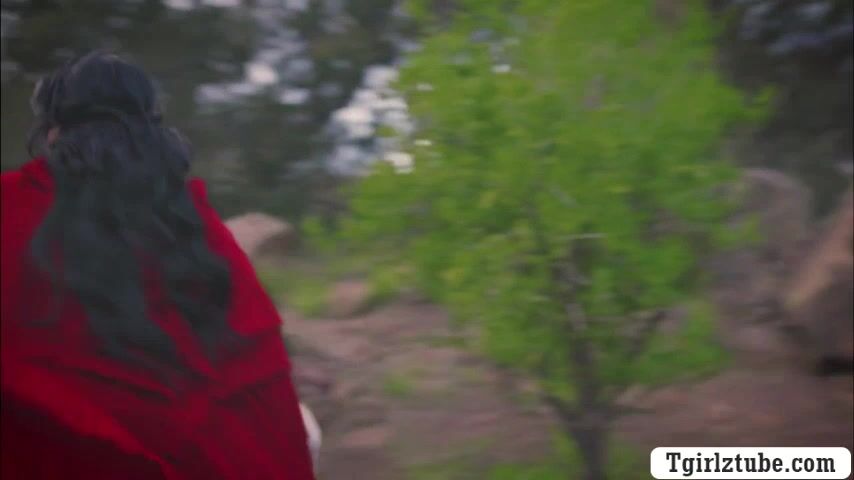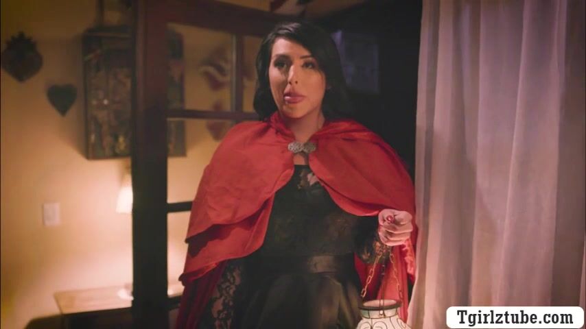 Latina shemale dressed in red hood with a wicker basket over her hand.After that,she go straight to the castle and she starts kissing the princess.Next is,she lets her suck her shecock passionatel and she then fucks princess wet pussy.