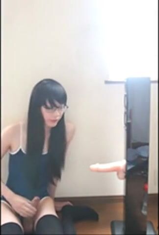 Cute Asian crossdresser cums on rubber cock