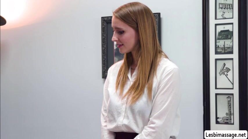 Milf blonde gives her beautiful assistant a shoulder massage because she looks so tired.After that,her hands slowly touching her secretarys tits and they kiss each other passionately.Next is,she lets her secretary bend over and she then licks her pussy