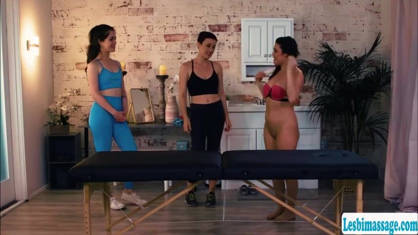 Busty latina avails the promo in the massage parlor 2 in 1 for a low price.She starts getting naked and the two masseuse start massaging her body.After that,they get horny and start licking their wet pussies in threesome way.