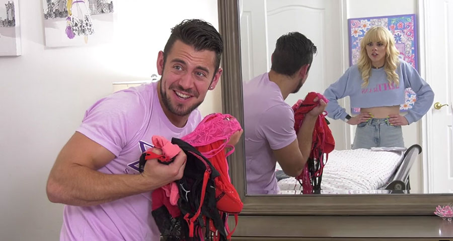 From a distance, masculine hunk stud Dante Colle is eyeing his new sexy blonde tranny babe Kate Zoha that he sneaks in and sniffs her underwear in the closet. But she finds him and teases him with sweet kisses until they moved in bed where she suck and rides his cock.