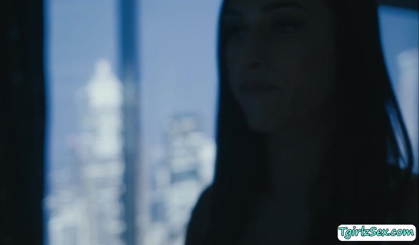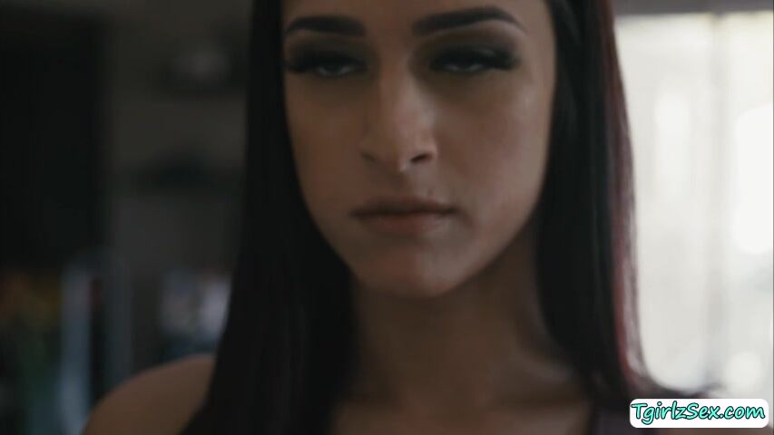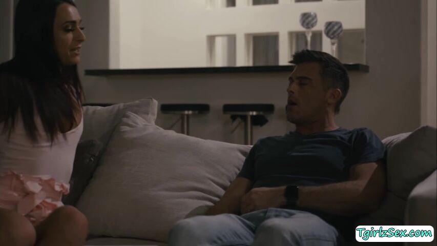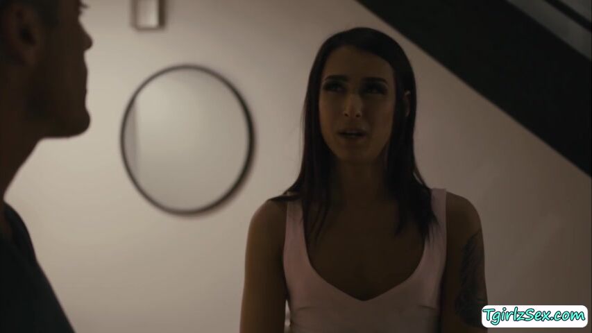 Brunette tattoed tranny Khloe Kay sucks the cock of her hunk friend