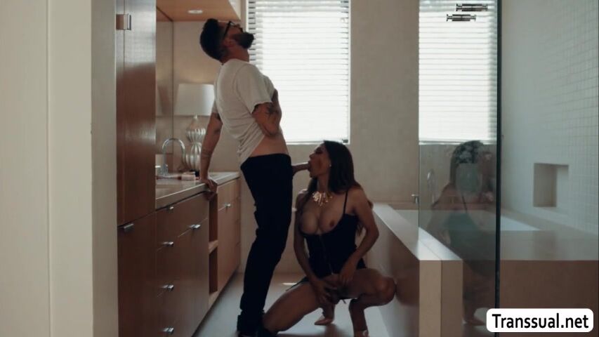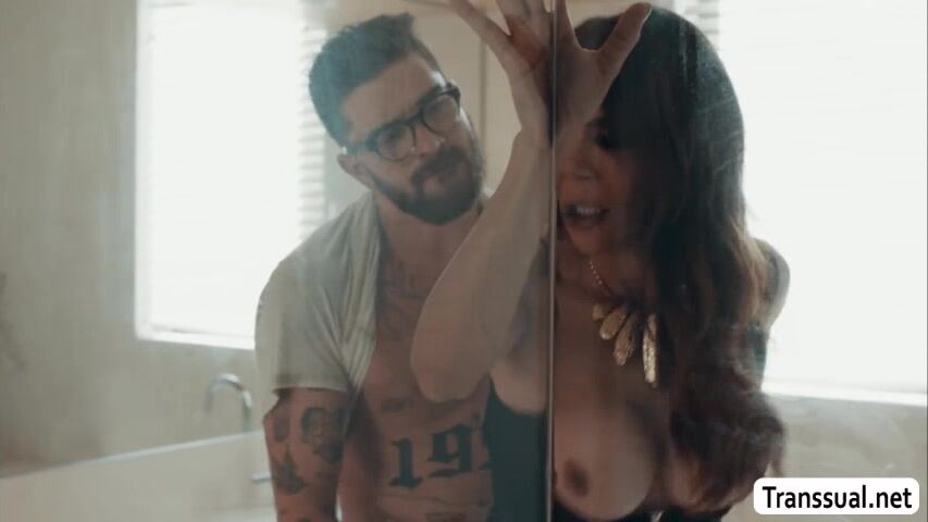 Horny shemale stepmother is jerking off her hard shecock in the bathroom.Suddenly,her stepson arrives and she then throats his big cock passionately.In return,her stepson fucks her wet ass so deep and hard.