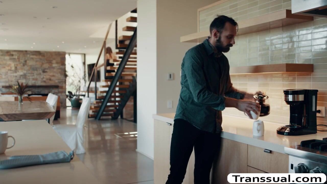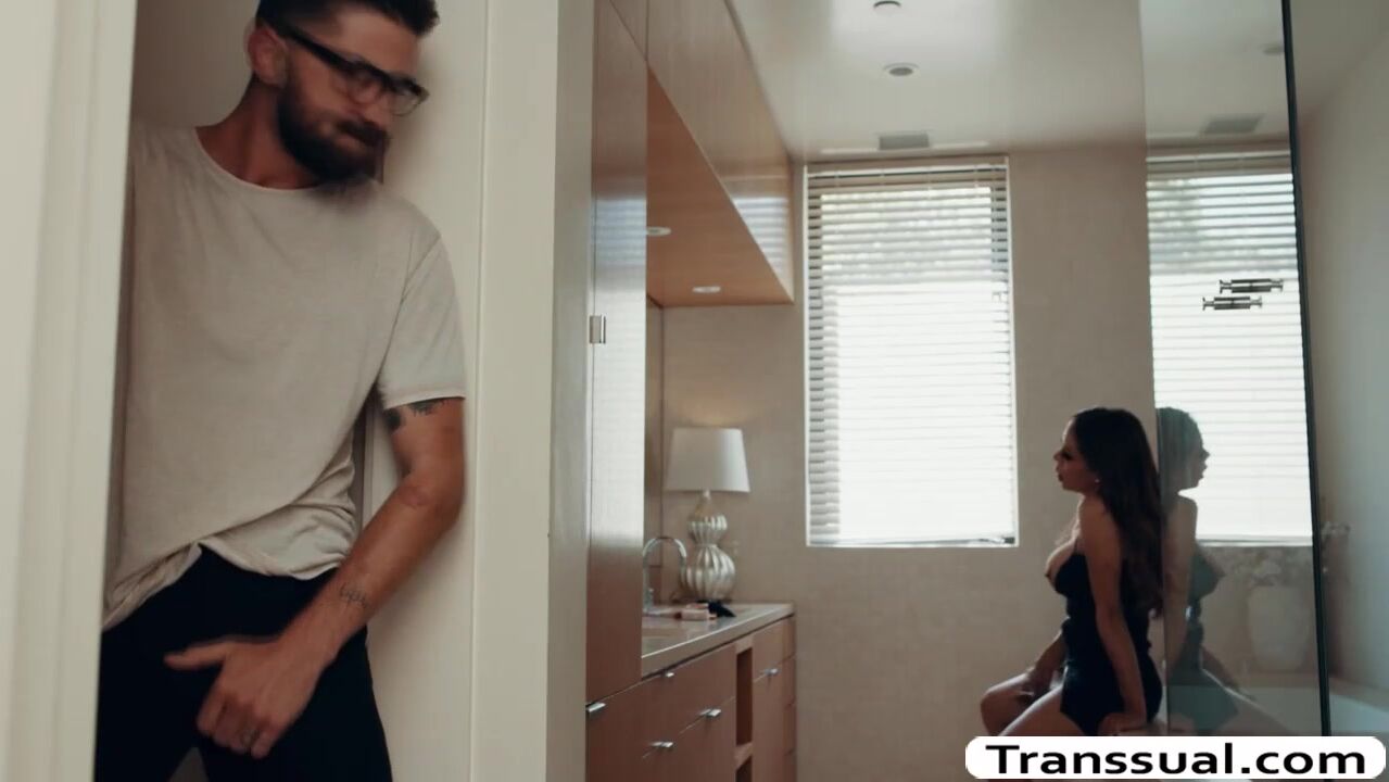 Shemale horny is in the bathroom jerking off her tranny cock passionately.Suddenly,she catches her stepson watching over and she then throats his big dick passionately.In return,her stepson fucks his busty TS stepmom wet ass so deep and hard.