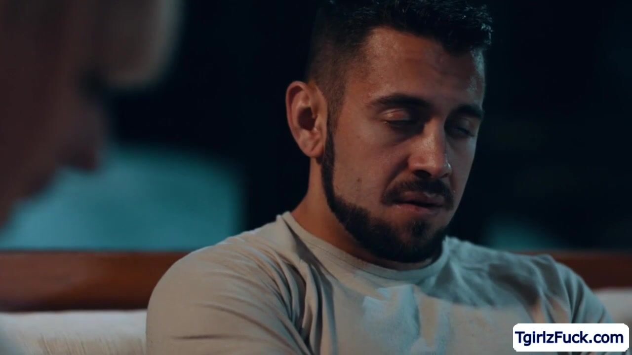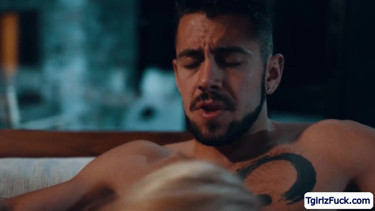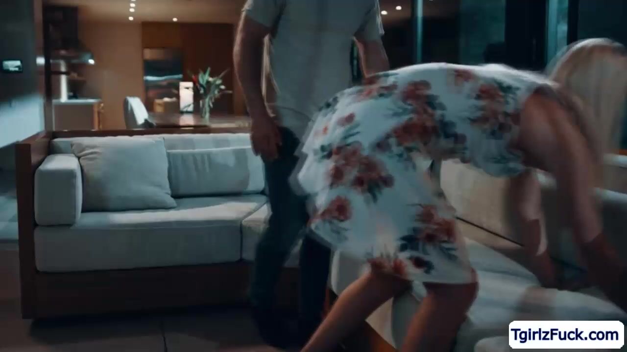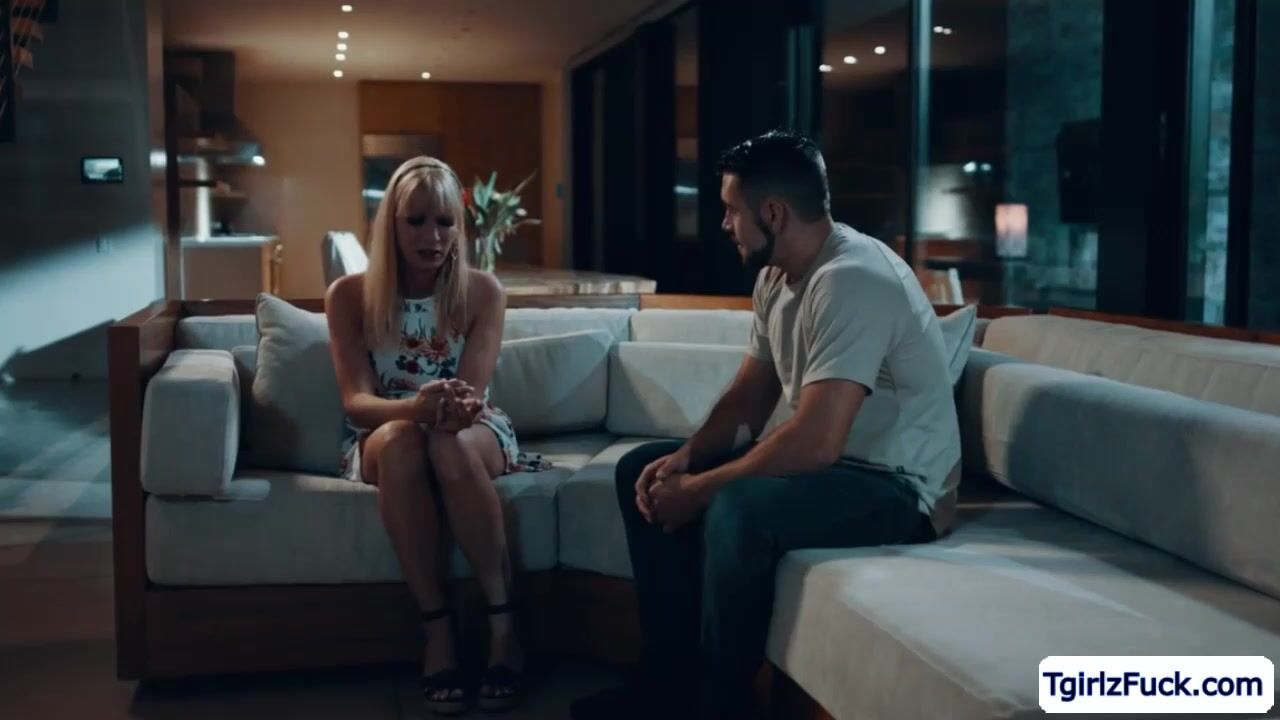 In the living room, busty blonde shemale Jamie French flirts with her stepson and kiss him torridly. The big tits ts stepmom deepthroats his big cock while stroking her tranny dick then stretches her big ass for a hardcore bareback in missionary.