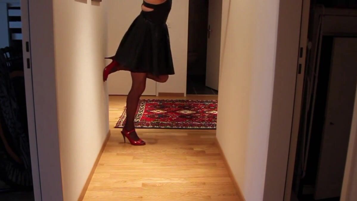 Dressed in Leather skirt and red high heels, play till cum