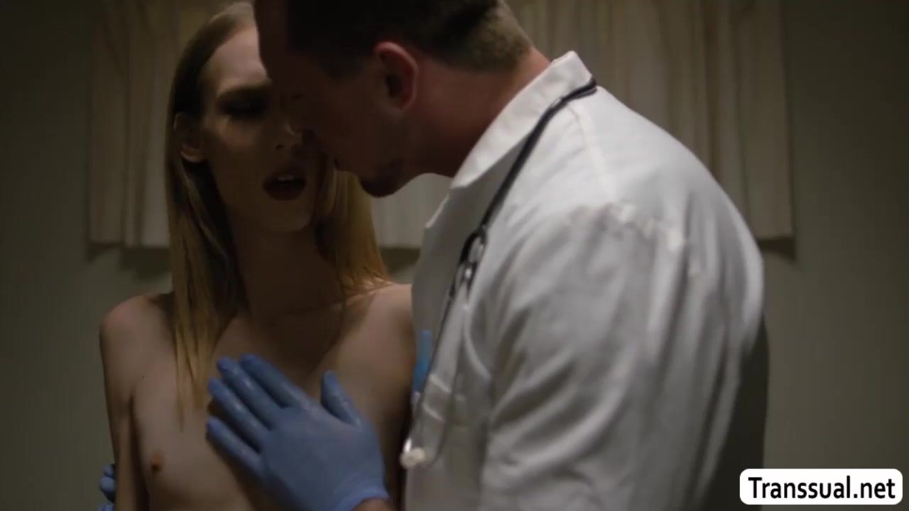 Smalltits shemale is in the office of her doctor and checked up by him.After that,the doctor gets horny and they start kissing each other.Next is,smalltits TS sucks doctors big cock passionately and in return,the doctor barebacks her wet ass so hard.