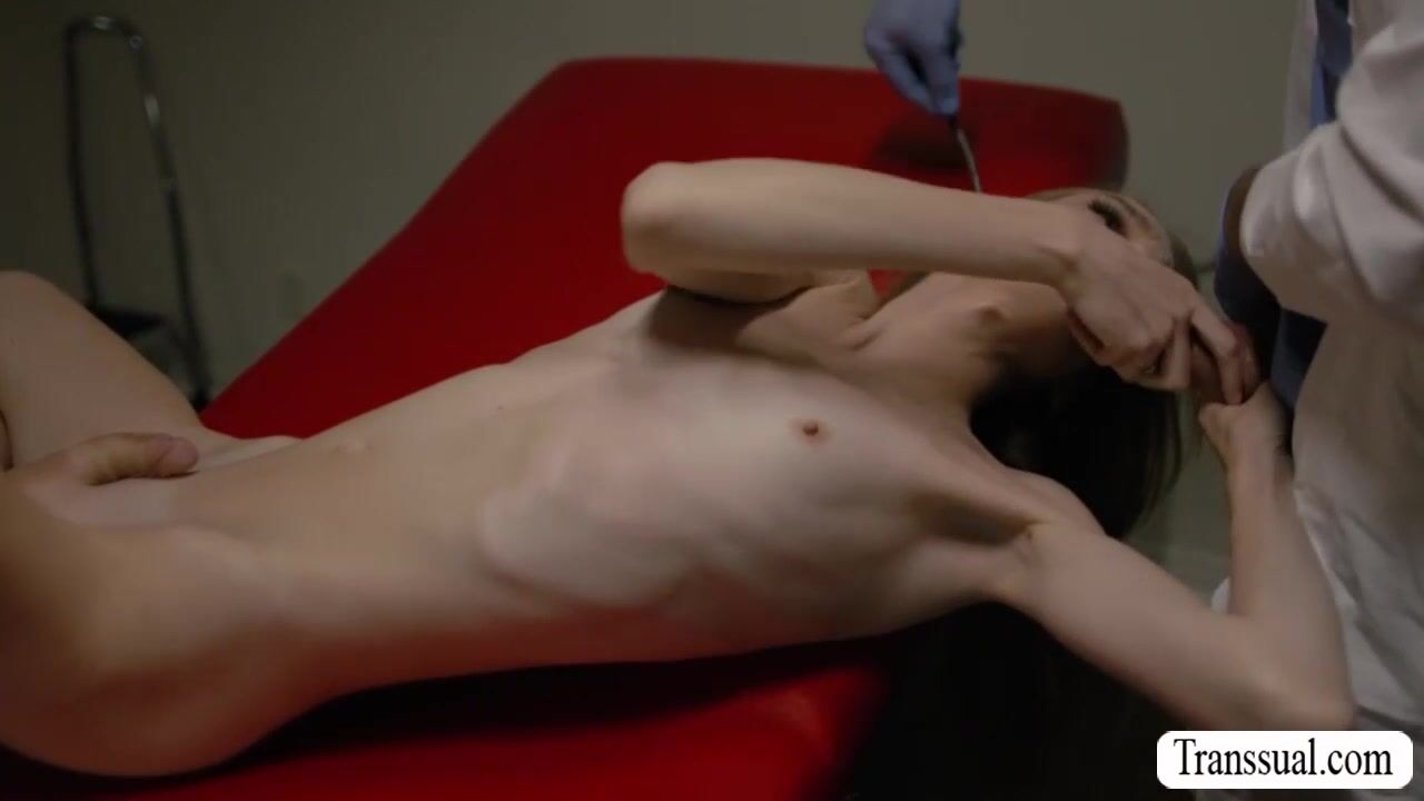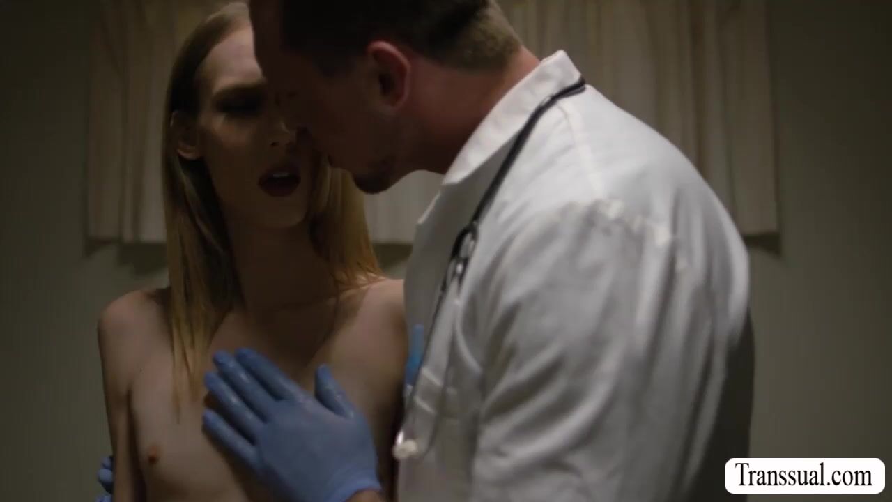 Skinny shemale is in the office of her doctor and checked up by him.After that,the doctor gets horny and they start kissing each other.Next is,smalltits TS sucks doctors big cock passionately and in return,the doctor barebacks her wet ass so hard.