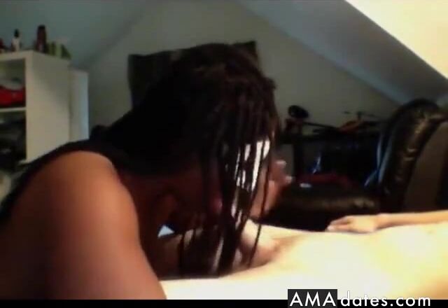 Cute ebony babe likes to suck white cock on camera. With a little mask that is. Meanwhile he watches some lesbian porn to get even quicker in the mood for shooting his sperm up to her tonsels.