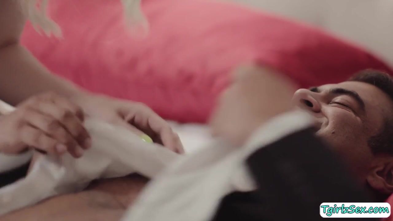 Petite blonde shemale Kate Zoha is joined by her stepdad in bed and begin kissing. The small tits tbabe gives his big cock a deepthroat blowjob in 69. In return, he stretches the tbabes big ass and gives it a bareback anal sex.