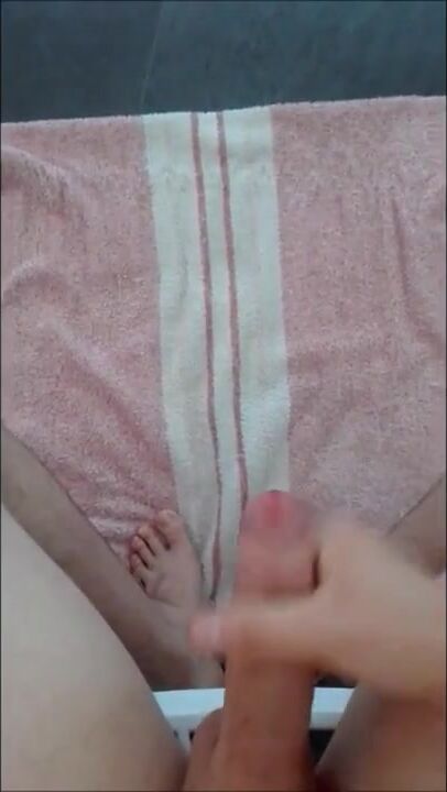 A young boy with a nice dick with foreskin cumming on a towel