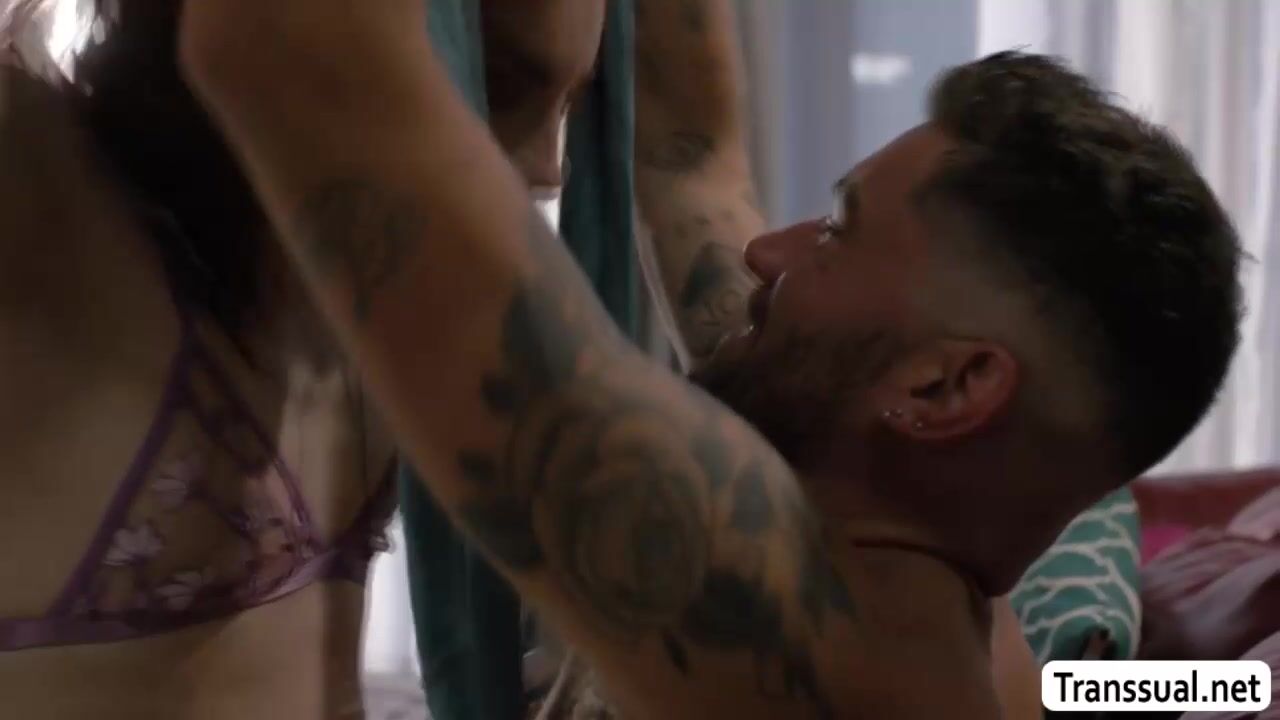 Sexy redhead shemale picks up a guy and brings him into her house while her husband is out.After that,smalltits TS throats the big cock of the guy passionately and in return,the dude barebacks her tight wet ass so deep and hard.