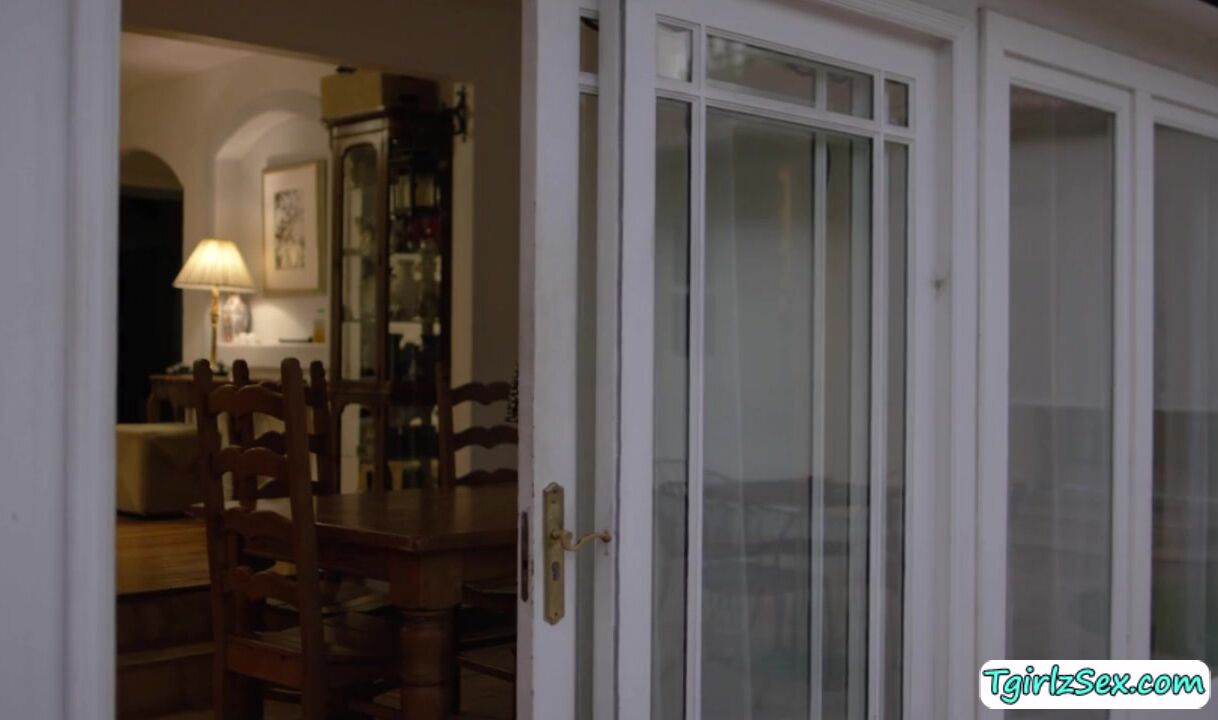 Busty brunette trans babe talks over the phone by the pool when she sees masculine stud Aspen cleaning with his temptng muscled body. The two go to the couch where they suck each others big cock and he anal barebacks her ass doggystyle and missionary.
