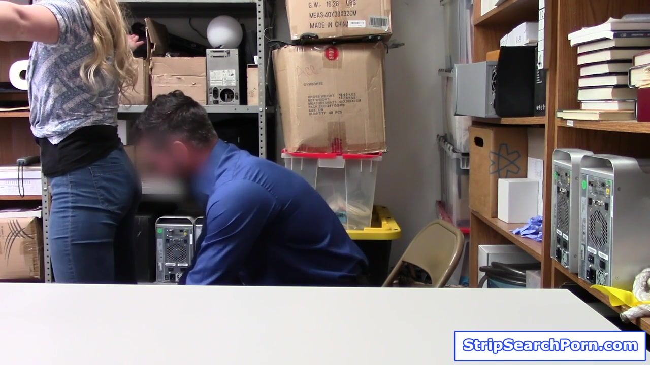 A security guard makes the blonde shoplifter submit to stripsearch.The stolen item was recovered and so he gives her an option to avoid cops.He takes his dick out and asks her to suck on it.The small tits babe blowjobs him then lets him fuck her