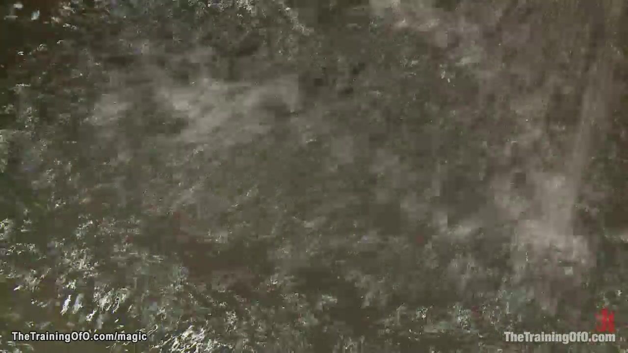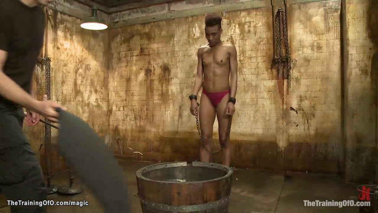 Slim ebony slave trainee Nikki Darling is put in chains and made wank two dicks on a sticks then spanked and dunked in bucket full with water by master James Mogul