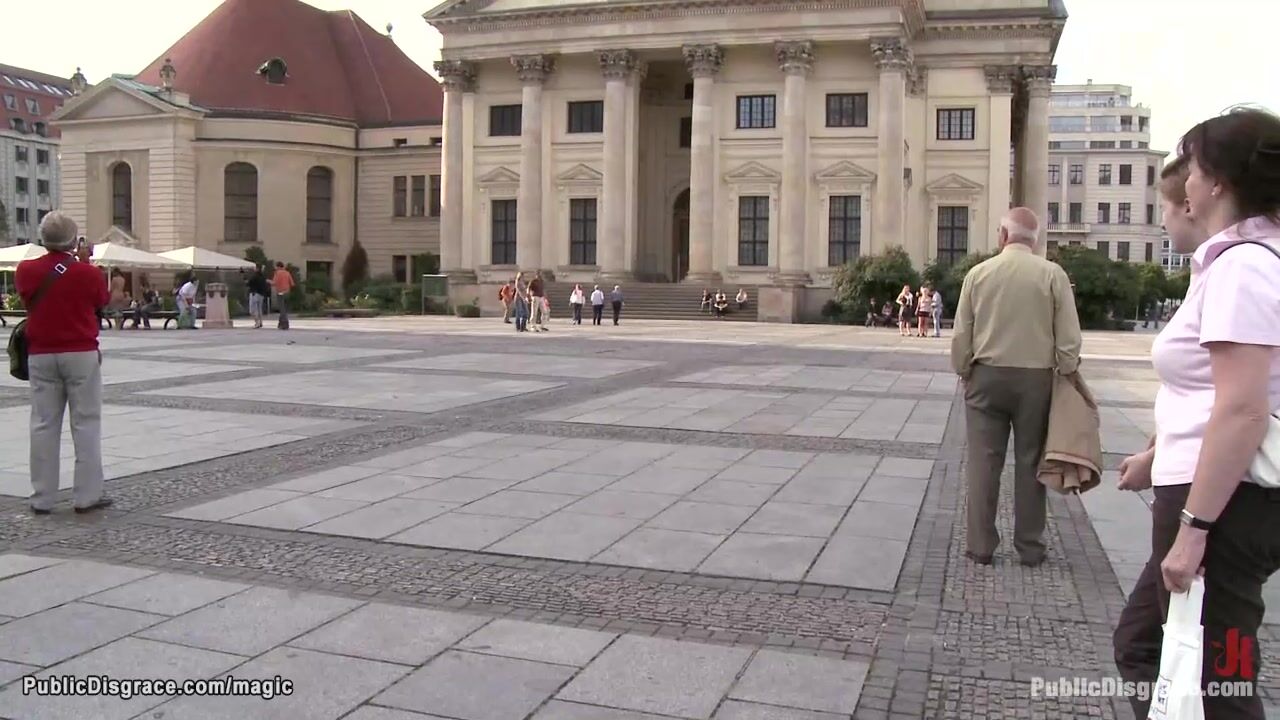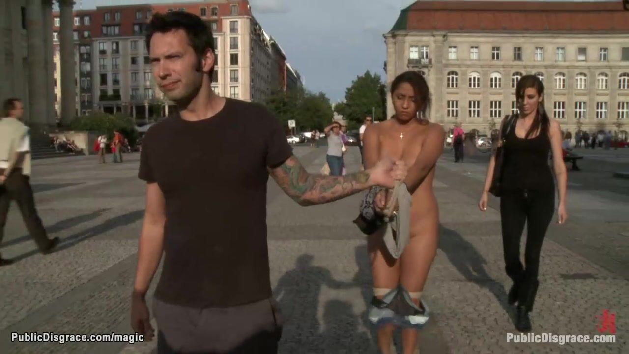 Naked big boobs brunette Spanish babe Veronica is walked and humiliated in public street then fucked in crowded caffe by Tommy Pistol and Princess Donna Dolore