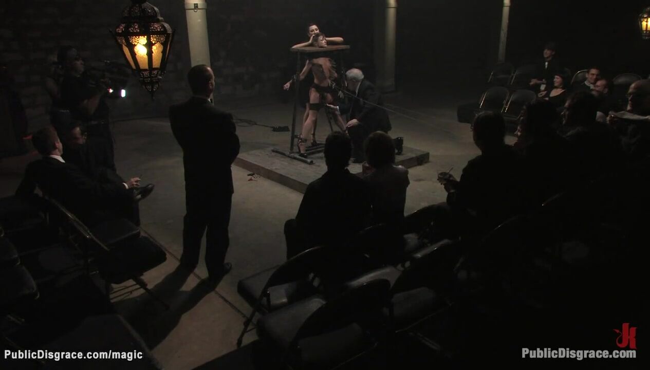 French slave Cecilia Vega is bound in upside down suspension gets pussy licked from strangers then mouth fucked by John Strong in public