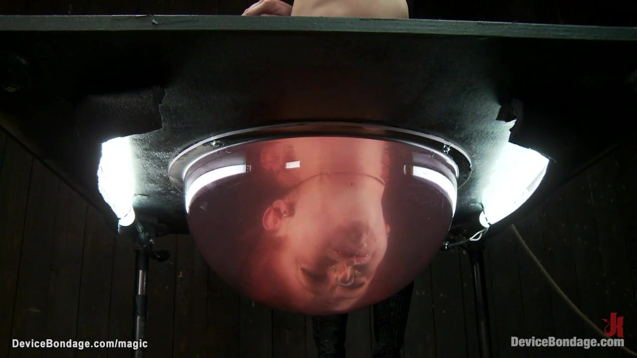 Lesbian redhead slave Tricia Oaks in inverted suspension gets head dunked in water then bound in metal pussy fingered by lezdom Claire Adams on device bondage