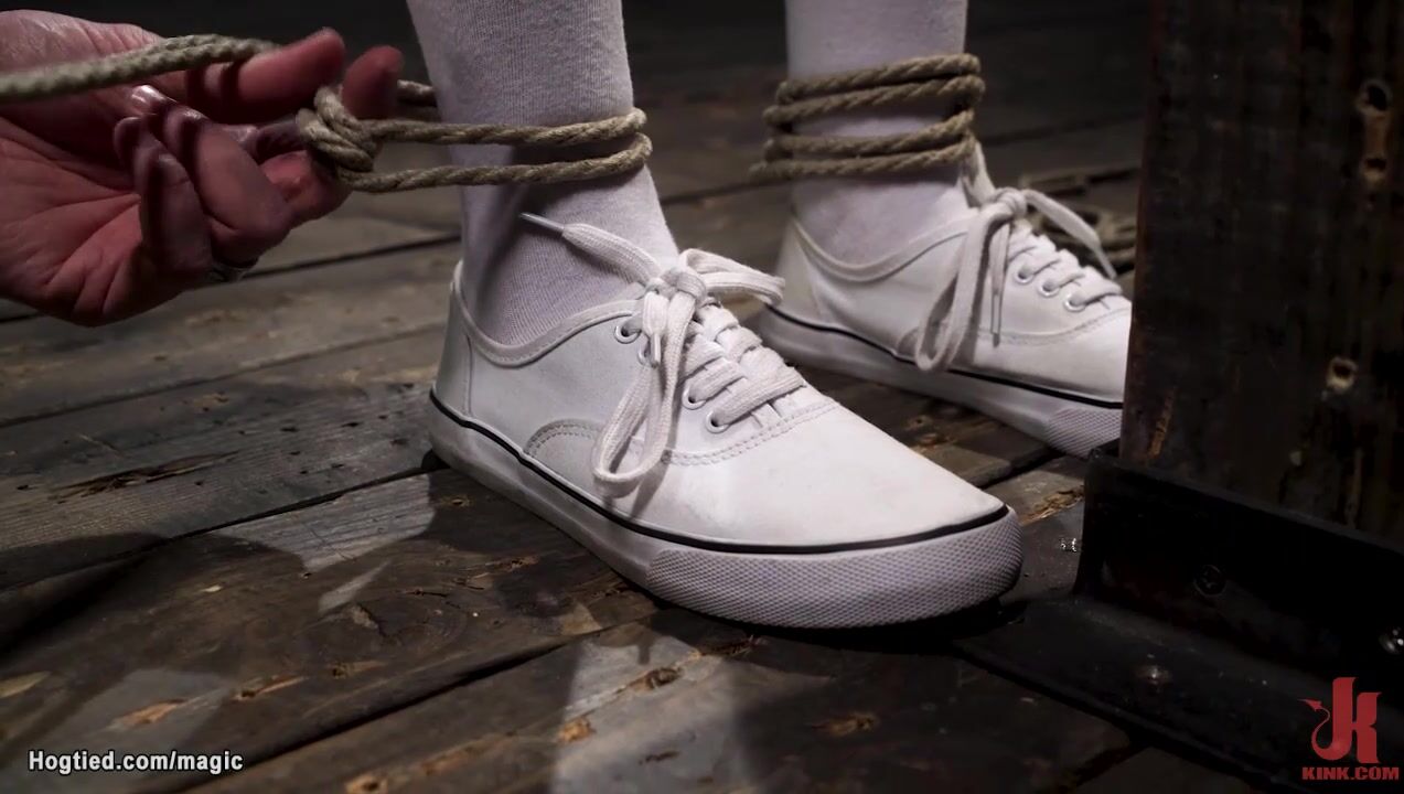 Bound with face aginst post Casey Calvert gets big ass paddled then takes crotch rope on the floor till hogtied pulled in suspension by master The Pope