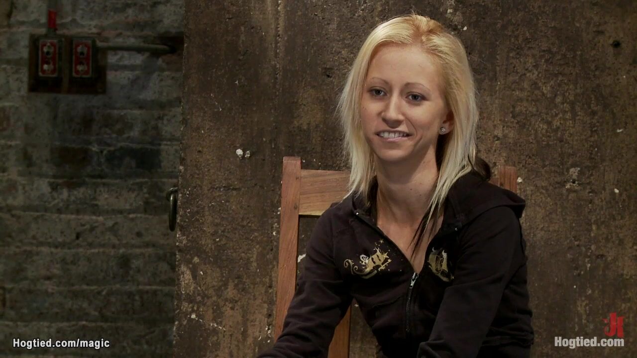 Little blonde slave Rene Phoenix is hogtied and gagged with ass hooked and hook tied to hair gets hard whipped then pulled in suspension by master Matt Williams