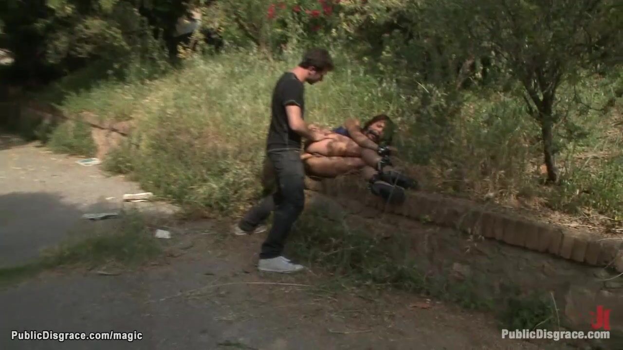 Busty Spanish slut Sara May is walked and himiliated in the streets then in the park cummed and anal fucked by big dick master James Deen