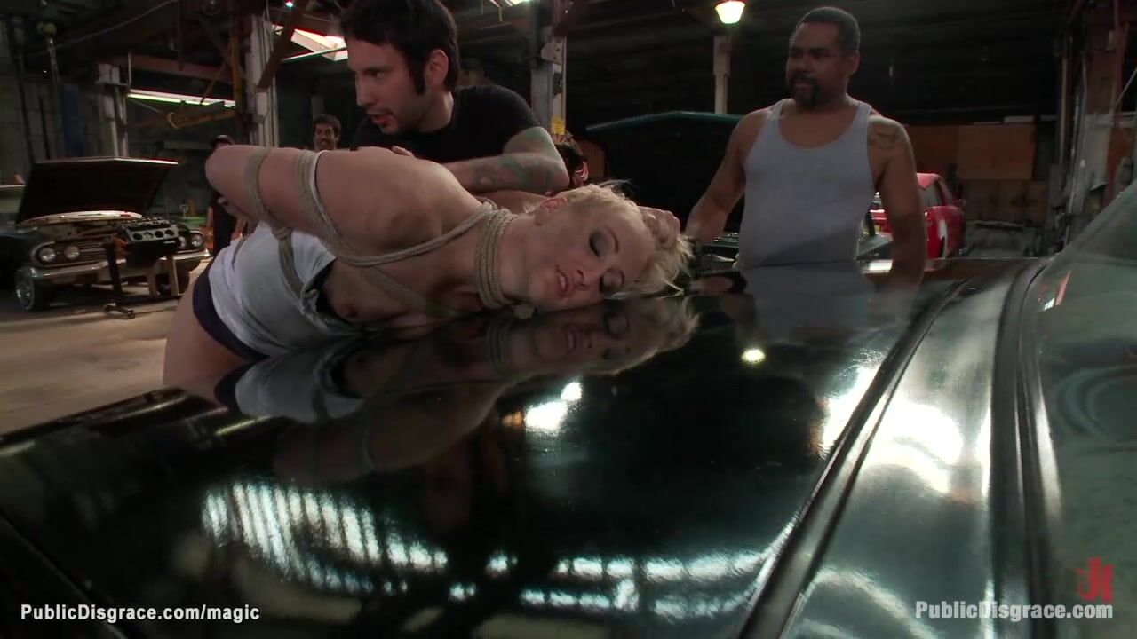 Master Tommy Pistol drags bound hot ass blonde slave Dylan Ryan in public auto repair shop and there spanks and anal fucks her with huge dick
