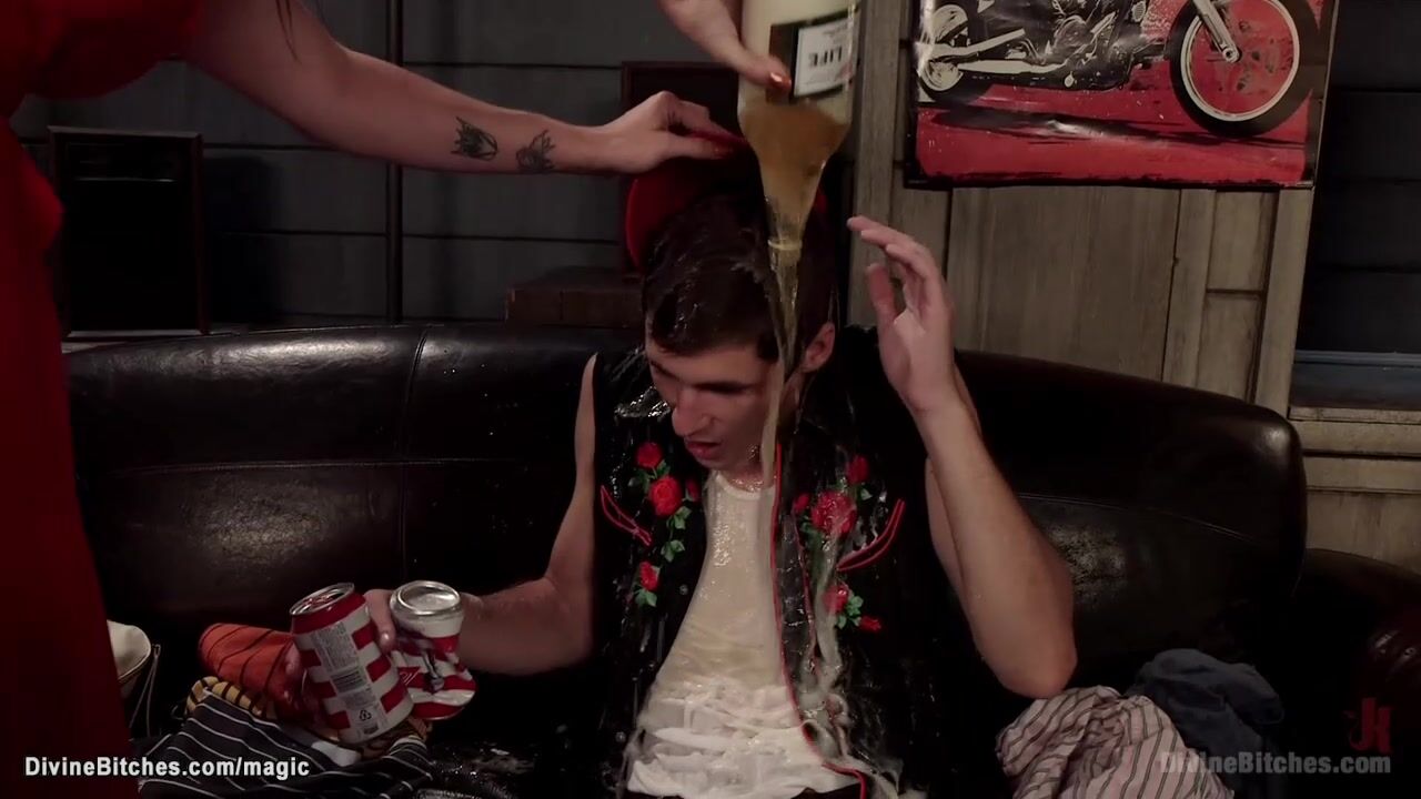 Big tits MILF wife Bella Rossi pours husband Tony Orlando then makes him eat her pussy till dresses up him in maid costume and pegs with strap on cock