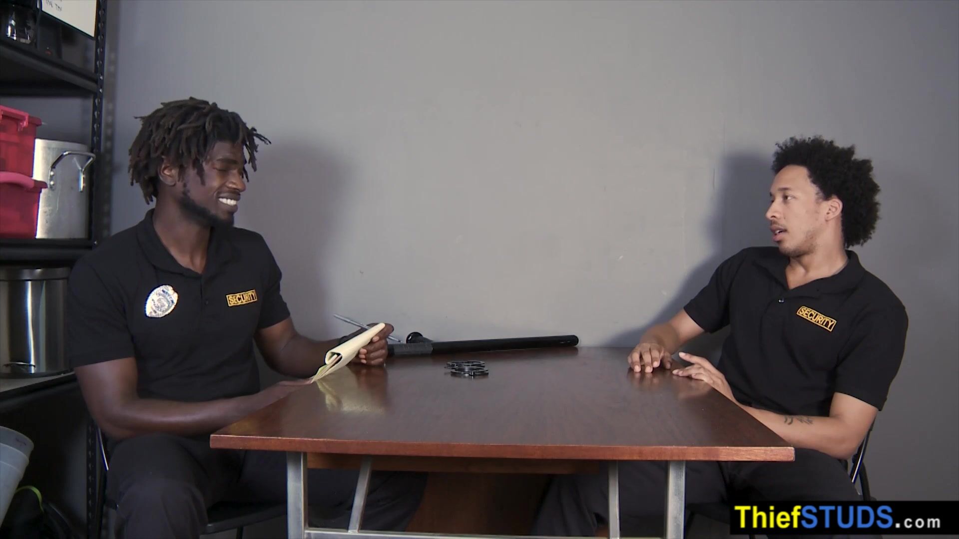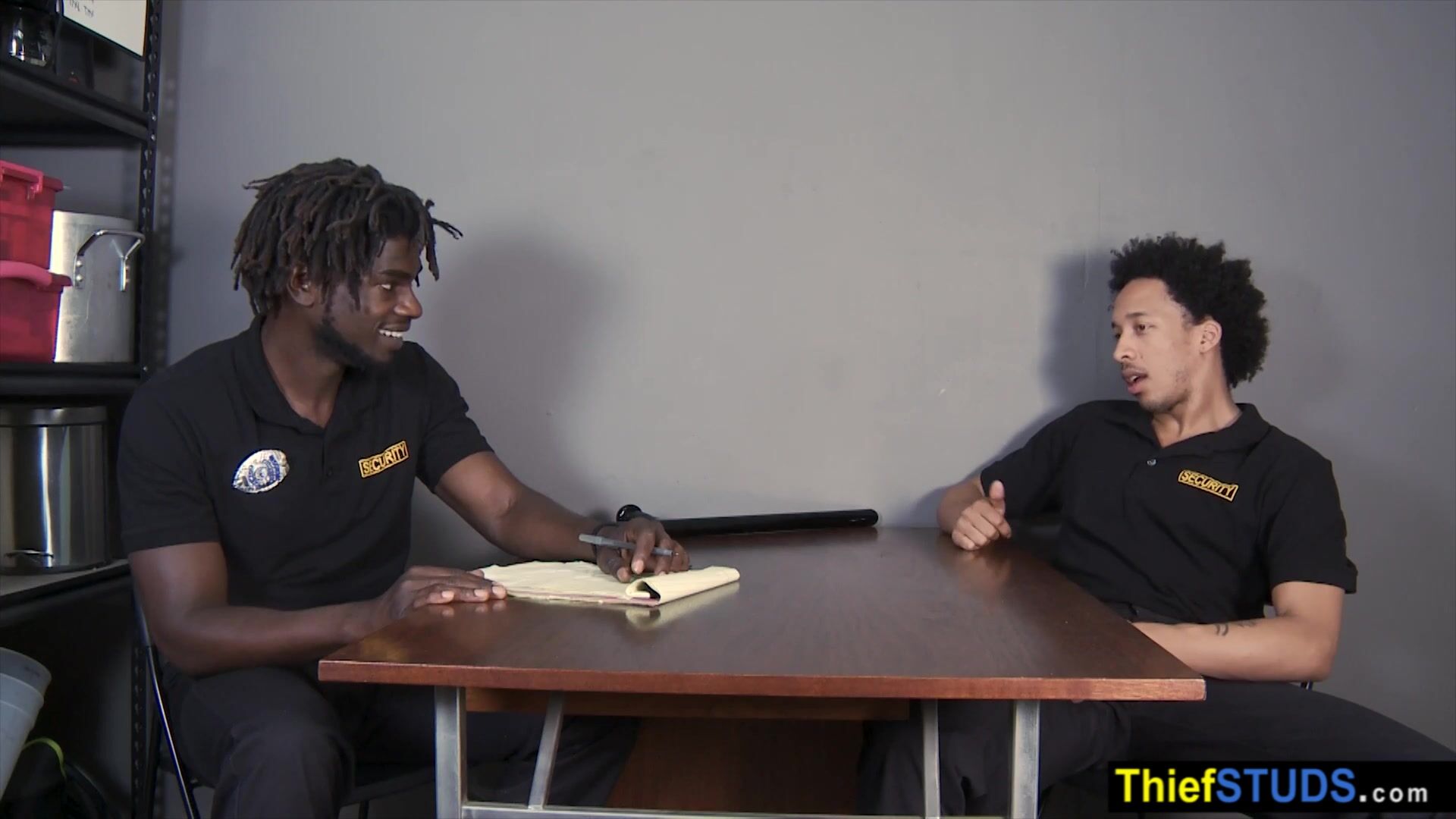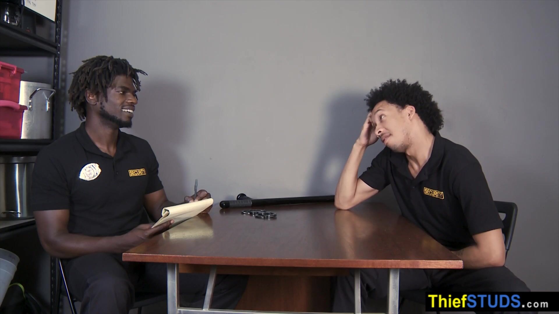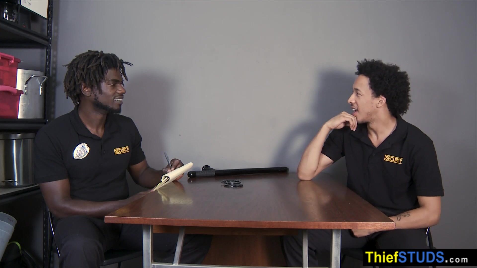 BBC LP officer Devin Trez interogating his black partner Tommy Bluezz then he ordering him to suck his big black cock to avoid jail then he using his baton to prepare his ass for a bareback anal fuck