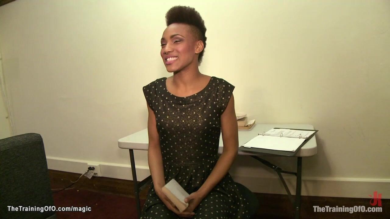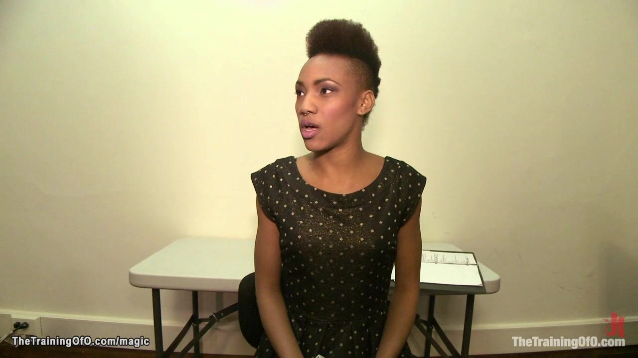 After interview with trainer James Mogul sexy slim ebony slave trainee Nikki Darling is taken in dungeon and spanked and whipped and fingered