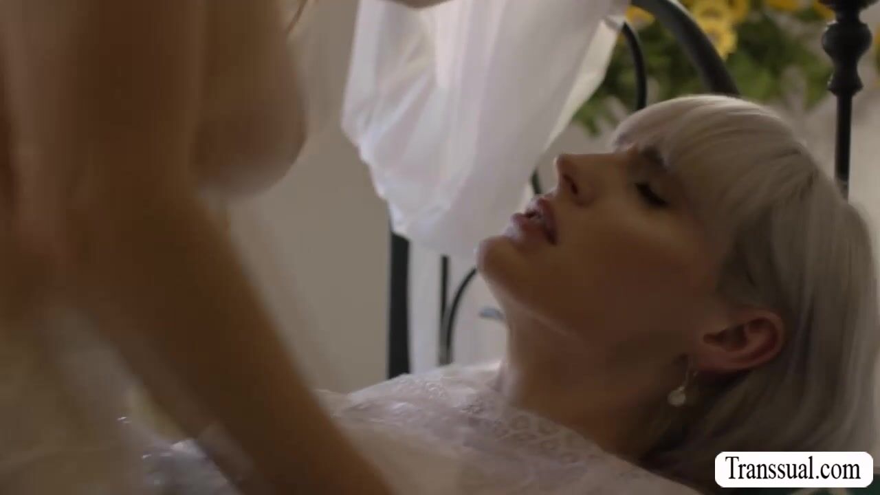 Busty brides maid and the shemale bride are in the room getting ready for the big wedding.Before that,they start kissing each other first and brides maid throats the shecock of the bride passionately,before she rides it.